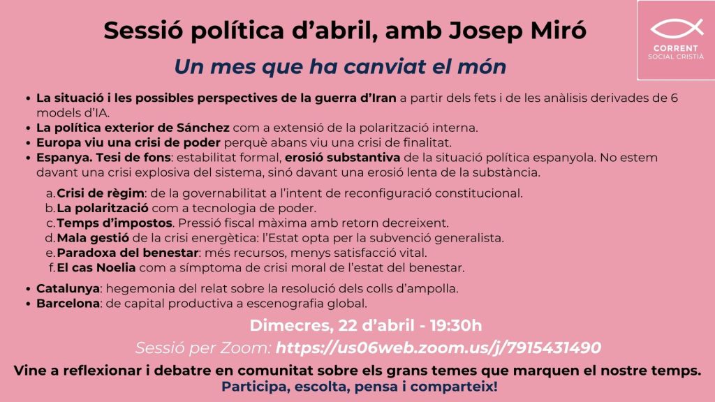 🗓 Dia: Dimecres, 22 d’abril⏰ Hora: 19:30 h💻 Zoom: https://us06web.zoom.us/j/7915431490🎤 Conferenciant: Josep Miró i Ardèvol ✨ No t’ho perdis! Connecta’t i participa en directe. – La situació i les possibles perspectives de la guerra d’Iran a partir dels fets i de les anàlisis derivades de 6 models d’IA. – La política exterior de Sánchez com a extensió de la polarització […]