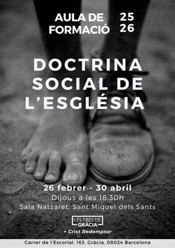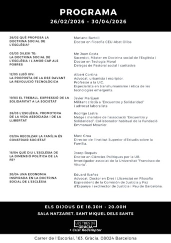 Amb aquest esperit, volem donar suport i difusió a la iniciativa de l’AULA DE FORMACIÓ 2025–2026, un cicle de conferències sobre la Doctrina Social de l’Església organitzat per l’Agrupació de Parròquies de Gràcia, amb la col·laboració de diversos socis del Corrent.